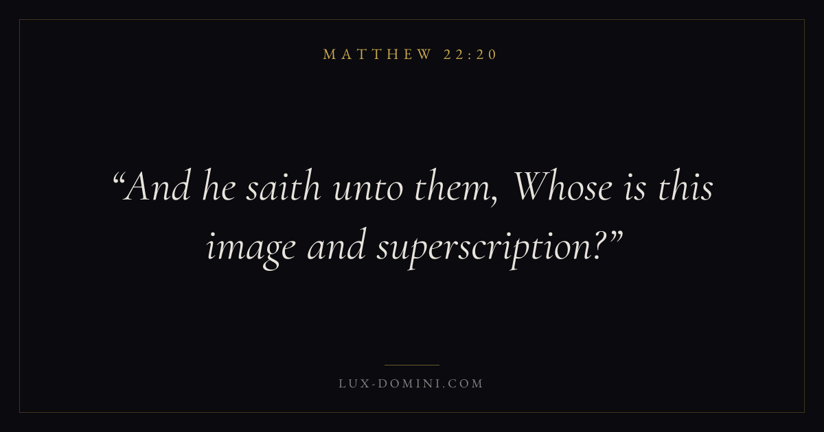Books / Matthew / Chapter 22 / Verse 20 ← Matthew 22:19 Matthew 22:20 Matthew 22:21 → And he saith unto them, Whose is this image and superscription? Download verse card Share on Twitter Share on Facebook Pin it ✦ Key themes FulfillmentKingdom of heavenDiscipleshipTeaching Read with Matthew 22:19 ✦ Matthew Chapter 22 verses V. 1 V. 2 V. 3 V. 4 V. 5 V. 6 V. 7 V. 8 V. 9 V. 10 V. 11 V. 12 V. 13 V. 14 V. 15 V. 16 V. 17 V. 18 V. 19 V. 20 V. 21 V. 22 V. 23 V. 24 V. 25 V. 26 V. 27 V. 28 V. 29 V. 30 V. 31 V. 32 V. 33 V. 34 V. 35 V. 36 V. 37 V. 38 V. 39 V. 40 V. 41 V. 42 V. 43 V. 44 V. 45 V. 46