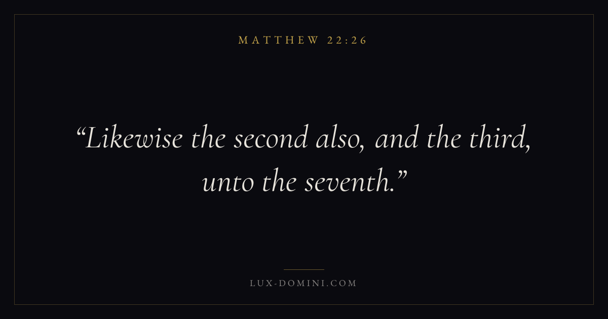 Books / Matthew / Chapter 22 / Verse 26 ← Matthew 22:25 Matthew 22:26 Matthew 22:27 → Likewise the second also, and the third, unto the seventh. Download verse card Share on Twitter Share on Facebook Pin it ✦ Key themes FulfillmentKingdom of heavenDiscipleshipTeaching Read with Matthew 22:23Matthew 22:24 ✦ Matthew Chapter 22 verses V. 1 V. 2 V. 3 V. 4 V. 5 V. 6 V. 7 V. 8 V. 9 V. 10 V. 11 V. 12 V. 13 V. 14 V. 15 V. 16 V. 17 V. 18 V. 19 V. 20 V. 21 V. 22 V. 23 V. 24 V. 25 V. 26 V. 27 V. 28 V. 29 V. 30 V. 31 V. 32 V. 33 V. 34 V. 35 V. 36 V. 37 V. 38 V. 39 V. 40 V. 41 V. 42 V. 43 V. 44 V. 45 V. 46