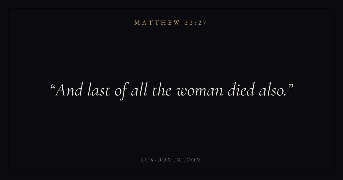 Books / Matthew / Chapter 22 / Verse 27 ← Matthew 22:26 Matthew 22:27 Matthew 22:28 → And last of all the woman died also. Download verse card Share on Twitter Share on Facebook Pin it ✦ Key themes FulfillmentKingdom of heavenDiscipleshipTeaching Read with Matthew 22:23Matthew 22:24 ✦ Matthew Chapter 22 verses V. 1 V. 2 V. 3 V. 4 V. 5 V. 6 V. 7 V. 8 V. 9 V. 10 V. 11 V. 12 V. 13 V. 14 V. 15 V. 16 V. 17 V. 18 V. 19 V. 20 V. 21 V. 22 V. 23 V. 24 V. 25 V. 26 V. 27 V. 28 V. 29 V. 30 V. 31 V. 32 V. 33 V. 34 V. 35 V. 36 V. 37 V. 38 V. 39 V. 40 V. 41 V. 42 V. 43 V. 44 V. 45 V. 46
