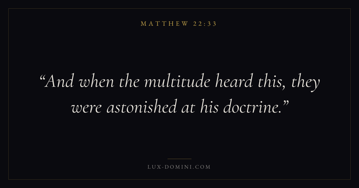Books / Matthew / Chapter 22 / Verse 33 ← Matthew 22:32 Matthew 22:33 Matthew 22:34 → And when the multitude heard this, they were astonished at his doctrine. Download verse card Share on Twitter Share on Facebook Pin it ✦ Key themes FulfillmentKingdom of heavenDiscipleshipTeaching Read with Matthew 22:29Matthew 22:30 ✦ Matthew Chapter 22 verses V. 1 V. 2 V. 3 V. 4 V. 5 V. 6 V. 7 V. 8 V. 9 V. 10 V. 11 V. 12 V. 13 V. 14 V. 15 V. 16 V. 17 V. 18 V. 19 V. 20 V. 21 V. 22 V. 23 V. 24 V. 25 V. 26 V. 27 V. 28 V. 29 V. 30 V. 31 V. 32 V. 33 V. 34 V. 35 V. 36 V. 37 V. 38 V. 39 V. 40 V. 41 V. 42 V. 43 V. 44 V. 45 V. 46