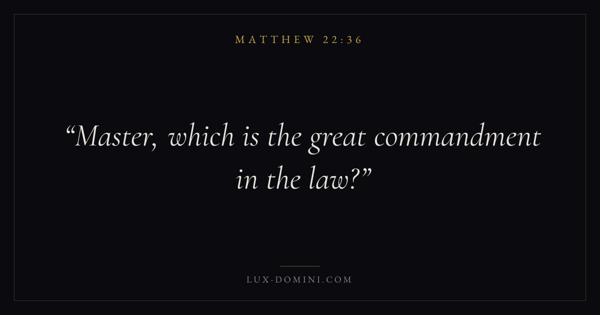 Books / Matthew / Chapter 22 / Verse 36 ← Matthew 22:35 Matthew 22:36 Matthew 22:37 → Master, which is the great commandment in the law? Download verse card Share on Twitter Share on Facebook Pin it ✦ Key themes FulfillmentKingdom of heavenDiscipleshipTeaching Read with Matthew 22:34Matthew 22:35 ✦ Matthew Chapter 22 verses V. 1 V. 2 V. 3 V. 4 V. 5 V. 6 V. 7 V. 8 V. 9 V. 10 V. 11 V. 12 V. 13 V. 14 V. 15 V. 16 V. 17 V. 18 V. 19 V. 20 V. 21 V. 22 V. 23 V. 24 V. 25 V. 26 V. 27 V. 28 V. 29 V. 30 V. 31 V. 32 V. 33 V. 34 V. 35 V. 36 V. 37 V. 38 V. 39 V. 40 V. 41 V. 42 V. 43 V. 44 V. 45 V. 46