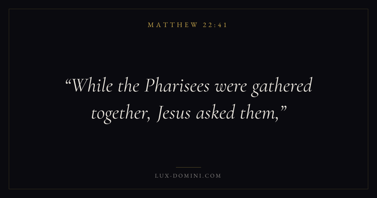 Books / Matthew / Chapter 22 / Verse 41 ← Matthew 22:40 Matthew 22:41 Matthew 22:42 → While the Pharisees were gathered together, Jesus asked them, Download verse card Share on Twitter Share on Facebook Pin it ✦ Key themes PrayerFulfillmentKingdom of heavenDiscipleship Read with Matthew 22:42Matthew 6:9Luke 18:1 Related topics Bible verses about prayer ✦ Matthew Chapter 22 verses V. 1 V. 2 V. 3 V. 4 V. 5 V. 6 V. 7 V. 8 V. 9 V. 10 V. 11 V. 12 V. 13 V. 14 V. 15 V. 16 V. 17 V. 18 V. 19 V. 20 V. 21 V. 22 V. 23 V. 24 V. 25 V. 26 V. 27 V. 28 V. 29 V. 30 V. 31 V. 32 V. 33 V. 34 V. 35 V. 36 V. 37 V. 38 V. 39 V. 40 V. 41 V. 42 V. 43 V. 44 V. 45 V. 46