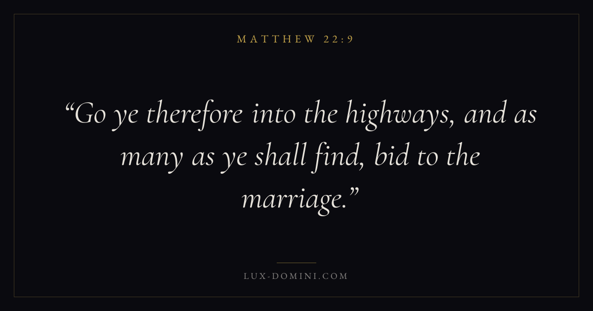 Go ye therefore into the highways, and as many as ye shall find, bid to the marriage.