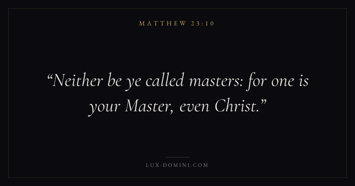 Books / Matthew / Chapter 23 / Verse 10 ← Matthew 23:9 Matthew 23:10 Matthew 23:11 → Neither be ye called masters: for one is your Master, even Christ. Download verse card Share on Twitter Share on Facebook Pin it ✦ Key themes FulfillmentKingdom of heavenDiscipleshipTeaching Read with Matthew 23:6Matthew 23:7 ✦ Matthew Chapter 23 verses V. 1 V. 2 V. 3 V. 4 V. 5 V. 6 V. 7 V. 8 V. 9 V. 10 V. 11 V. 12 V. 13 V. 14 V. 15 V. 16 V. 17 V. 18 V. 19 V. 20 V. 21 V. 22 V. 23 V. 24 V. 25 V. 26 V. 27 V. 28 V. 29 V. 30 V. 31 V. 32 V. 33 V. 34 V. 35 V. 36 V. 37 V. 38 V. 39