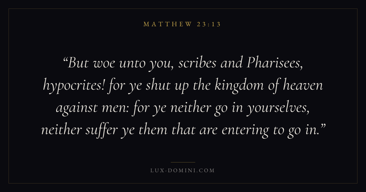 But woe unto you, scribes and Pharisees, hypocrites! for ye shut up the kingdom of heaven against men: for ye neither go in yourselves, neither suffer ye them that are entering to go in.