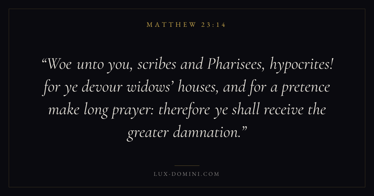 Woe unto you, scribes and Pharisees, hypocrites! for ye devour widows’ houses, and for a pretence make long prayer: therefore ye shall receive the greater damnation.