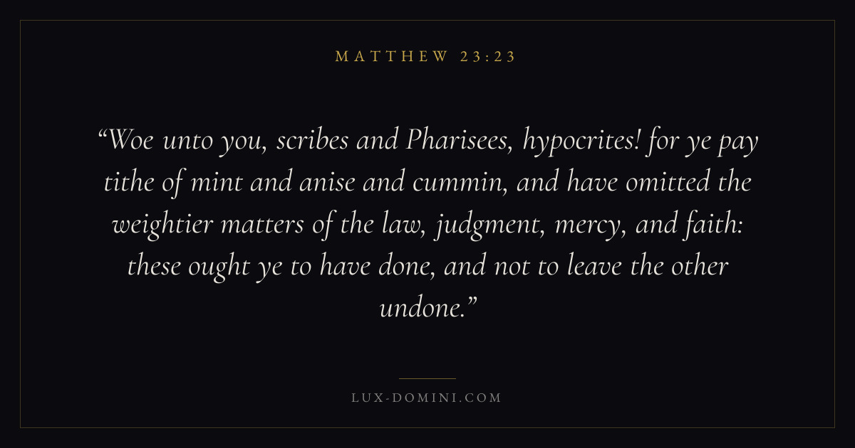 Woe unto you, scribes and Pharisees, hypocrites! for ye pay tithe of mint and anise and cummin, and have omitted the weightier matters of the law, judgment, mercy, and faith: these ought ye to have done, and not to leave the other undone.