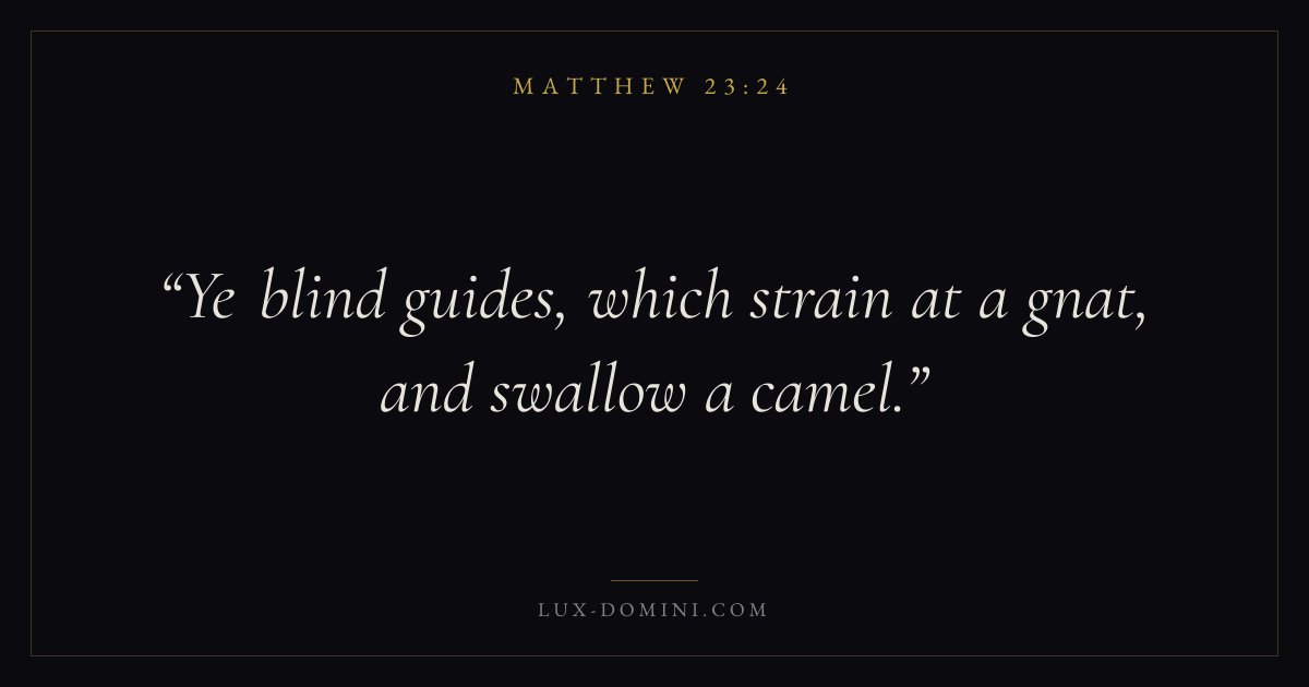 Books / Matthew / Chapter 23 / Verse 24 ← Matthew 23:23 Matthew 23:24 Matthew 23:25 → Ye blind guides, which strain at a gnat, and swallow a camel. Download verse card Share on Twitter Share on Facebook Pin it ✦ Key themes SalvationFulfillmentKingdom of heavenDiscipleship Read with Matthew 23:23John 3:16Ephesians 2:8 Related topics Bible verses about salvation ✦ Matthew Chapter 23 verses V. 1 V. 2 V. 3 V. 4 V. 5 V. 6 V. 7 V. 8 V. 9 V. 10 V. 11 V. 12 V. 13 V. 14 V. 15 V. 16 V. 17 V. 18 V. 19 V. 20 V. 21 V. 22 V. 23 V. 24 V. 25 V. 26 V. 27 V. 28 V. 29 V. 30 V. 31 V. 32 V. 33 V. 34 V. 35 V. 36 V. 37 V. 38 V. 39