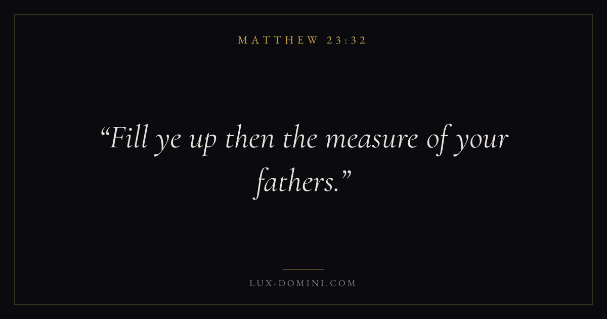 Books / Matthew / Chapter 23 / Verse 32 ← Matthew 23:31 Matthew 23:32 Matthew 23:33 → Fill ye up then the measure of your fathers. Download verse card Share on Twitter Share on Facebook Pin it ✦ Key themes SalvationFulfillmentKingdom of heavenDiscipleship Read with Matthew 23:33John 3:16Ephesians 2:8 Related topics Bible verses about salvation ✦ Matthew Chapter 23 verses V. 1 V. 2 V. 3 V. 4 V. 5 V. 6 V. 7 V. 8 V. 9 V. 10 V. 11 V. 12 V. 13 V. 14 V. 15 V. 16 V. 17 V. 18 V. 19 V. 20 V. 21 V. 22 V. 23 V. 24 V. 25 V. 26 V. 27 V. 28 V. 29 V. 30 V. 31 V. 32 V. 33 V. 34 V. 35 V. 36 V. 37 V. 38 V. 39