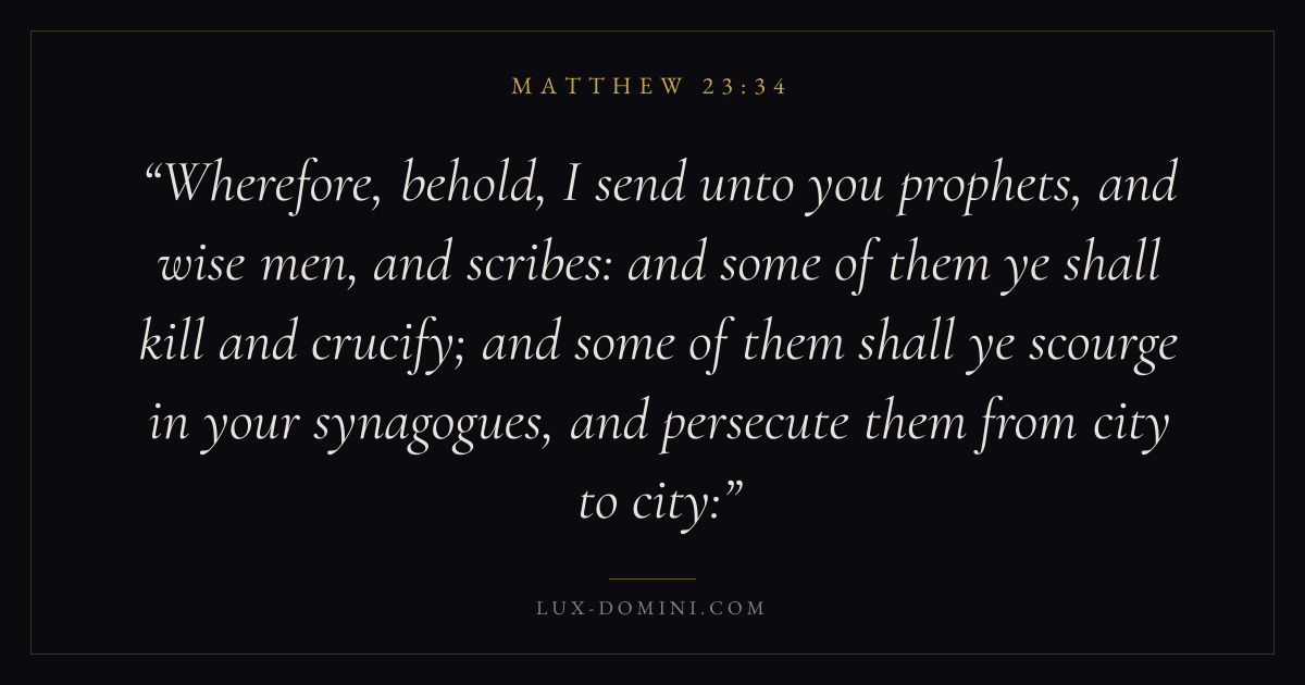 Wherefore, behold, I send unto you prophets, and wise men, and scribes: and some of them ye shall kill and crucify; and some of them shall ye scourge in your synagogues, and persecute them from city to city: