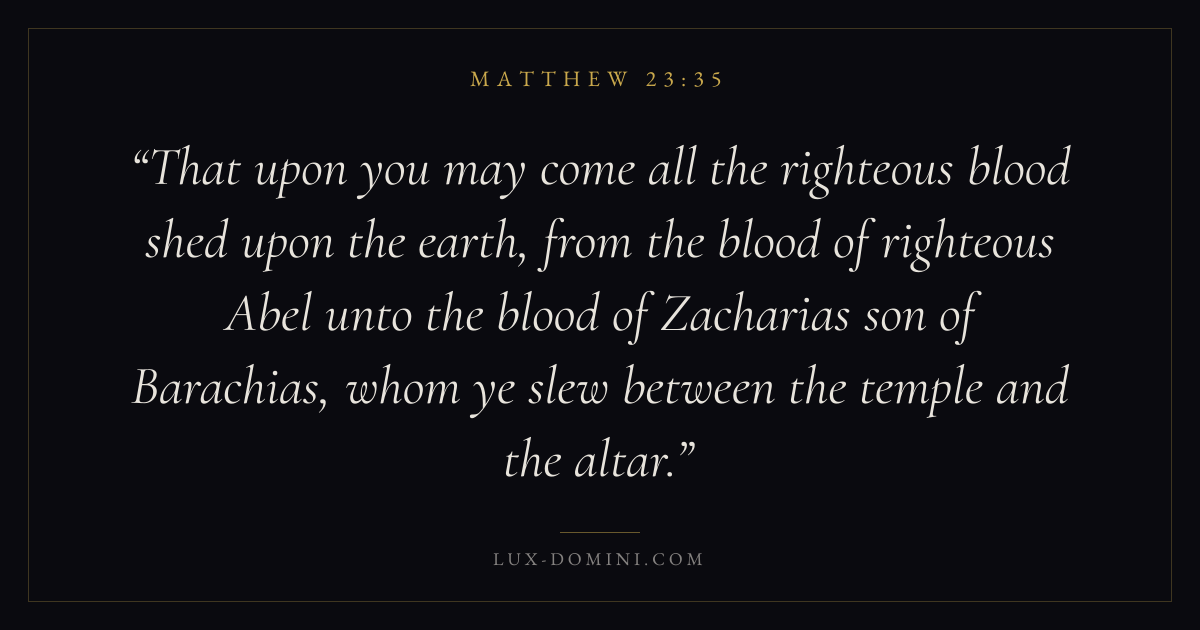 That upon you may come all the righteous blood shed upon the earth, from the blood of righteous Abel unto the blood of Zacharias son of Barachias, whom ye slew between the temple and the altar.