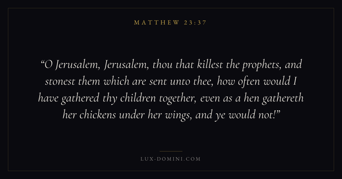 O Jerusalem, Jerusalem, thou that killest the prophets, and stonest them which are sent unto thee, how often would I have gathered thy children together, even as a hen gathereth her chickens under her wings, and ye would not!