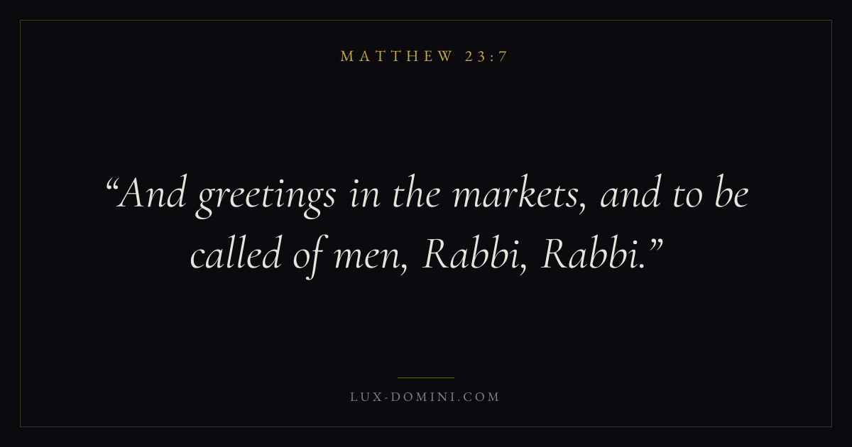 Books / Matthew / Chapter 23 / Verse 7 ← Matthew 23:6 Matthew 23:7 Matthew 23:8 → And greetings in the markets, and to be called of men, Rabbi, Rabbi. Download verse card Share on Twitter Share on Facebook Pin it ✦ Key themes FulfillmentKingdom of heavenDiscipleshipTeaching Read with Matthew 23:6Matthew 23:8 ✦ Matthew Chapter 23 verses V. 1 V. 2 V. 3 V. 4 V. 5 V. 6 V. 7 V. 8 V. 9 V. 10 V. 11 V. 12 V. 13 V. 14 V. 15 V. 16 V. 17 V. 18 V. 19 V. 20 V. 21 V. 22 V. 23 V. 24 V. 25 V. 26 V. 27 V. 28 V. 29 V. 30 V. 31 V. 32 V. 33 V. 34 V. 35 V. 36 V. 37 V. 38 V. 39