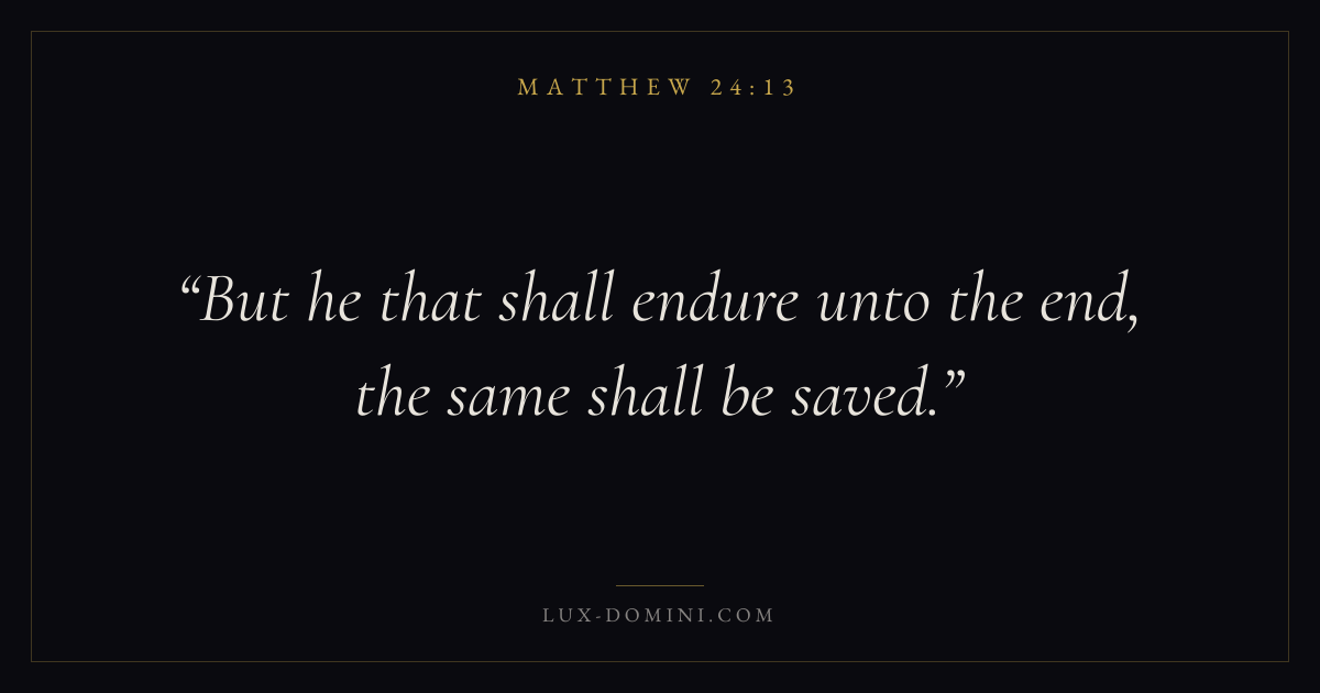 Books / Matthew / Chapter 24 / Verse 13 ← Matthew 24:12 Matthew 24:13 Matthew 24:14 → But he that shall endure unto the end, the same shall be saved. Download verse card Share on Twitter Share on Facebook Pin it ✦ Key themes PrayerSalvationFulfillmentKingdom of heaven Read with Matthew 24:14Matthew 6:9Luke 18:1John 3:16 Related topics Bible verses about prayerBible verses about salvation ✦ Matthew Chapter 24 verses V. 1 V. 2 V. 3 V. 4 V. 5 V. 6 V. 7 V. 8 V. 9 V. 10 V. 11 V. 12 V. 13 V. 14 V. 15 V. 16 V. 17 V. 18 V. 19 V. 20 V. 21 V. 22 V. 23 V. 24 V. 25 V. 26 V. 27 V. 28 V. 29 V. 30 V. 31 V. 32 V. 33 V. 34 V. 35 V. 36 V. 37 V. 38 V. 39 V. 40 V. 41 V. 42 V. 43 V. 44 V. 45 V. 46 V. 47 V. 48 V. 49 V. 50 V. 51