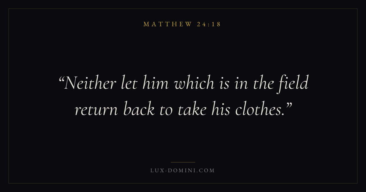 Books / Matthew / Chapter 24 / Verse 18 ← Matthew 24:17 Matthew 24:18 Matthew 24:19 → Neither let him which is in the field return back to take his clothes. Download verse card Share on Twitter Share on Facebook Pin it ✦ Key themes PrayerFulfillmentKingdom of heavenDiscipleship Read with Matthew 24:15Matthew 24:16Matthew 6:9Luke 18:1 Related topics Bible verses about prayer ✦ Matthew Chapter 24 verses V. 1 V. 2 V. 3 V. 4 V. 5 V. 6 V. 7 V. 8 V. 9 V. 10 V. 11 V. 12 V. 13 V. 14 V. 15 V. 16 V. 17 V. 18 V. 19 V. 20 V. 21 V. 22 V. 23 V. 24 V. 25 V. 26 V. 27 V. 28 V. 29 V. 30 V. 31 V. 32 V. 33 V. 34 V. 35 V. 36 V. 37 V. 38 V. 39 V. 40 V. 41 V. 42 V. 43 V. 44 V. 45 V. 46 V. 47 V. 48 V. 49 V. 50 V. 51