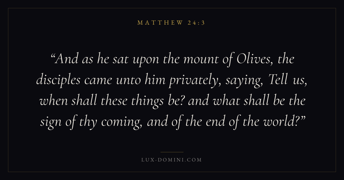 And as he sat upon the mount of Olives, the disciples came unto him privately, saying, Tell us, when shall these things be? and what shall be the sign of thy coming, and of the end of the world?