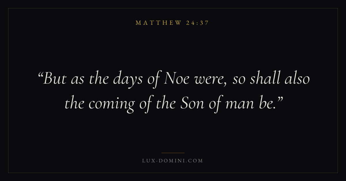 Books / Matthew / Chapter 24 / Verse 37 ← Matthew 24:36 Matthew 24:37 Matthew 24:38 → But as the days of Noe were, so shall also the coming of the Son of man be. Download verse card Share on Twitter Share on Facebook Pin it ✦ Key themes FulfillmentKingdom of heavenDiscipleshipTeaching Read with Matthew 24:36Matthew 24:38 ✦ Matthew Chapter 24 verses V. 1 V. 2 V. 3 V. 4 V. 5 V. 6 V. 7 V. 8 V. 9 V. 10 V. 11 V. 12 V. 13 V. 14 V. 15 V. 16 V. 17 V. 18 V. 19 V. 20 V. 21 V. 22 V. 23 V. 24 V. 25 V. 26 V. 27 V. 28 V. 29 V. 30 V. 31 V. 32 V. 33 V. 34 V. 35 V. 36 V. 37 V. 38 V. 39 V. 40 V. 41 V. 42 V. 43 V. 44 V. 45 V. 46 V. 47 V. 48 V. 49 V. 50 V. 51