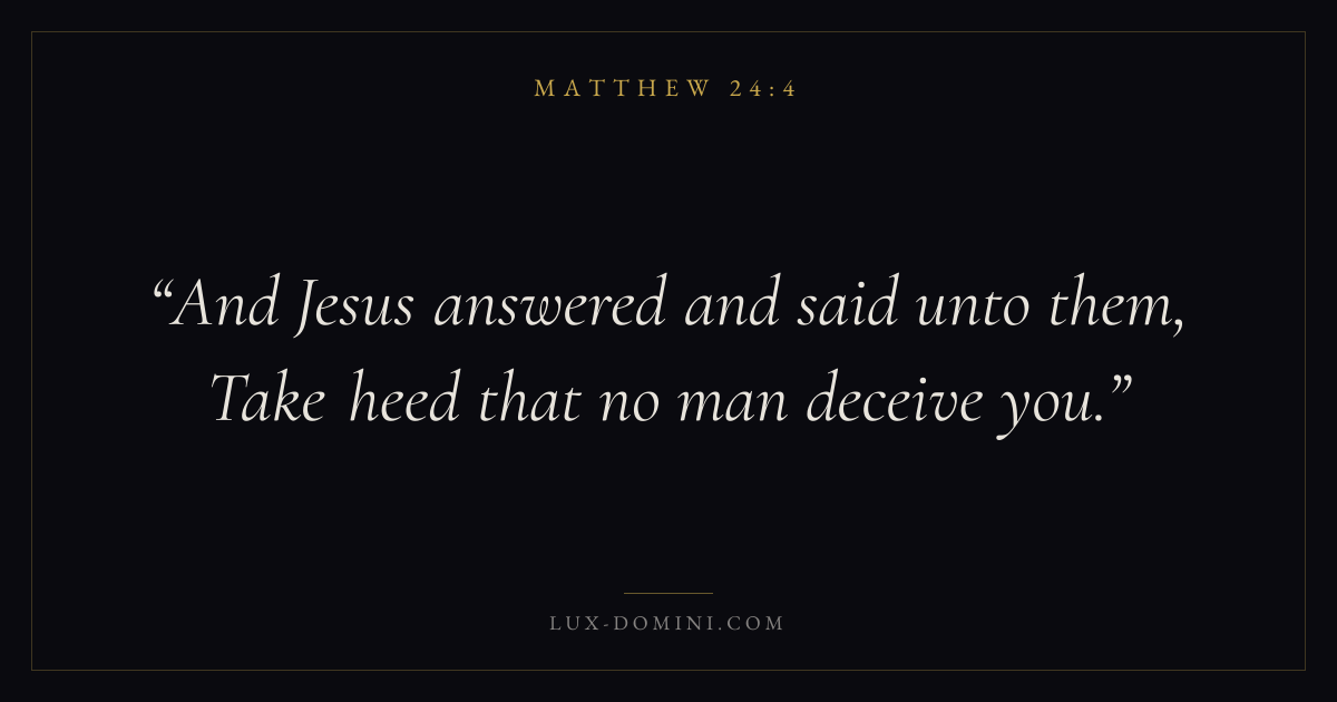 Books / Matthew / Chapter 24 / Verse 4 ← Matthew 24:3 Matthew 24:4 Matthew 24:5 → And Jesus answered and said unto them, Take heed that no man deceive you. Download verse card Share on Twitter Share on Facebook Pin it ✦ Key themes PrayerFulfillmentKingdom of heavenDiscipleship Read with Matthew 24:3Matthew 24:5Matthew 6:9Luke 18:1 Related topics Bible verses about prayer ✦ Matthew Chapter 24 verses V. 1 V. 2 V. 3 V. 4 V. 5 V. 6 V. 7 V. 8 V. 9 V. 10 V. 11 V. 12 V. 13 V. 14 V. 15 V. 16 V. 17 V. 18 V. 19 V. 20 V. 21 V. 22 V. 23 V. 24 V. 25 V. 26 V. 27 V. 28 V. 29 V. 30 V. 31 V. 32 V. 33 V. 34 V. 35 V. 36 V. 37 V. 38 V. 39 V. 40 V. 41 V. 42 V. 43 V. 44 V. 45 V. 46 V. 47 V. 48 V. 49 V. 50 V. 51