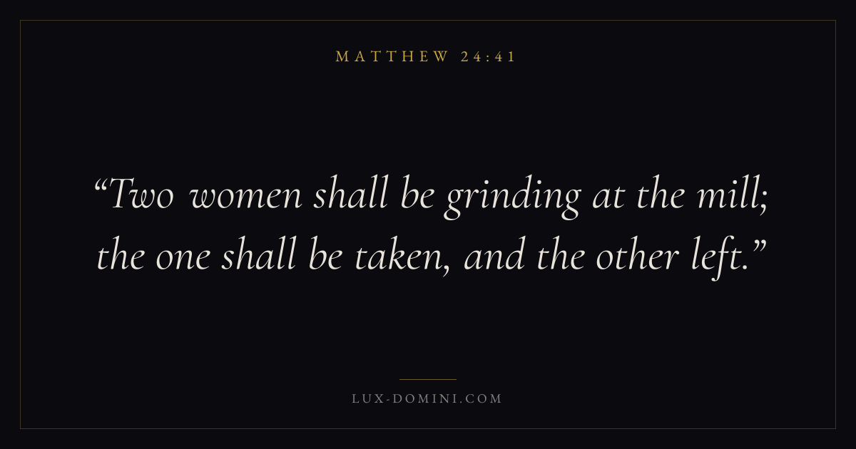 Books / Matthew / Chapter 24 / Verse 41 ← Matthew 24:40 Matthew 24:41 Matthew 24:42 → Two women shall be grinding at the mill; the one shall be taken, and the other left. Download verse card Share on Twitter Share on Facebook Pin it ✦ Key themes FulfillmentKingdom of heavenDiscipleshipTeaching ✦ Matthew Chapter 24 verses V. 1 V. 2 V. 3 V. 4 V. 5 V. 6 V. 7 V. 8 V. 9 V. 10 V. 11 V. 12 V. 13 V. 14 V. 15 V. 16 V. 17 V. 18 V. 19 V. 20 V. 21 V. 22 V. 23 V. 24 V. 25 V. 26 V. 27 V. 28 V. 29 V. 30 V. 31 V. 32 V. 33 V. 34 V. 35 V. 36 V. 37 V. 38 V. 39 V. 40 V. 41 V. 42 V. 43 V. 44 V. 45 V. 46 V. 47 V. 48 V. 49 V. 50 V. 51