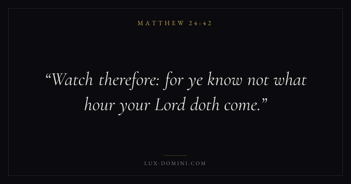 Books / Matthew / Chapter 24 / Verse 42 ← Matthew 24:41 Matthew 24:42 Matthew 24:43 → Watch therefore: for ye know not what hour your Lord doth come. Download verse card Share on Twitter Share on Facebook Pin it ✦ Key themes Justice and mercyFulfillmentKingdom of heavenDiscipleship Read with Matthew 24:43Matthew 24:44Micah 6:8Amos 5:24 Related topics Bible verses about justice and mercy ✦ Matthew Chapter 24 verses V. 1 V. 2 V. 3 V. 4 V. 5 V. 6 V. 7 V. 8 V. 9 V. 10 V. 11 V. 12 V. 13 V. 14 V. 15 V. 16 V. 17 V. 18 V. 19 V. 20 V. 21 V. 22 V. 23 V. 24 V. 25 V. 26 V. 27 V. 28 V. 29 V. 30 V. 31 V. 32 V. 33 V. 34 V. 35 V. 36 V. 37 V. 38 V. 39 V. 40 V. 41 V. 42 V. 43 V. 44 V. 45 V. 46 V. 47 V. 48 V. 49 V. 50 V. 51