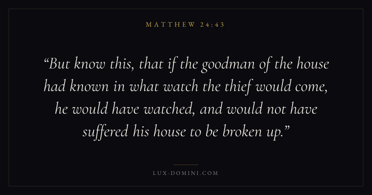 But know this, that if the goodman of the house had known in what watch the thief would come, he would have watched, and would not have suffered his house to be broken up.
