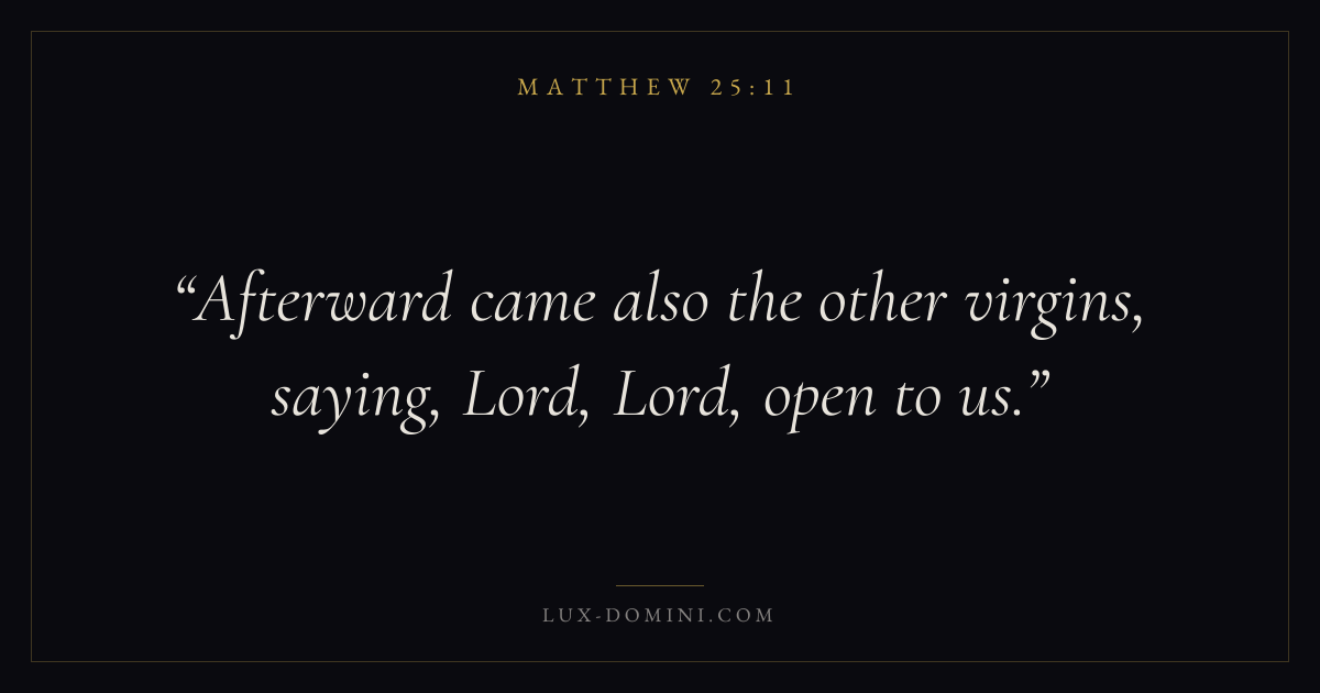 Books / Matthew / Chapter 25 / Verse 11 ← Matthew 25:10 Matthew 25:11 Matthew 25:12 → Afterward came also the other virgins, saying, Lord, Lord, open to us. Download verse card Share on Twitter Share on Facebook Pin it ✦ Key themes FulfillmentKingdom of heavenDiscipleshipTeaching Read with Matthew 25:10Matthew 25:12 ✦ Matthew Chapter 25 verses V. 1 V. 2 V. 3 V. 4 V. 5 V. 6 V. 7 V. 8 V. 9 V. 10 V. 11 V. 12 V. 13 V. 14 V. 15 V. 16 V. 17 V. 18 V. 19 V. 20 V. 21 V. 22 V. 23 V. 24 V. 25 V. 26 V. 27 V. 28 V. 29 V. 30 V. 31 V. 32 V. 33 V. 34 V. 35 V. 36 V. 37 V. 38 V. 39 V. 40 V. 41 V. 42 V. 43 V. 44 V. 45 V. 46