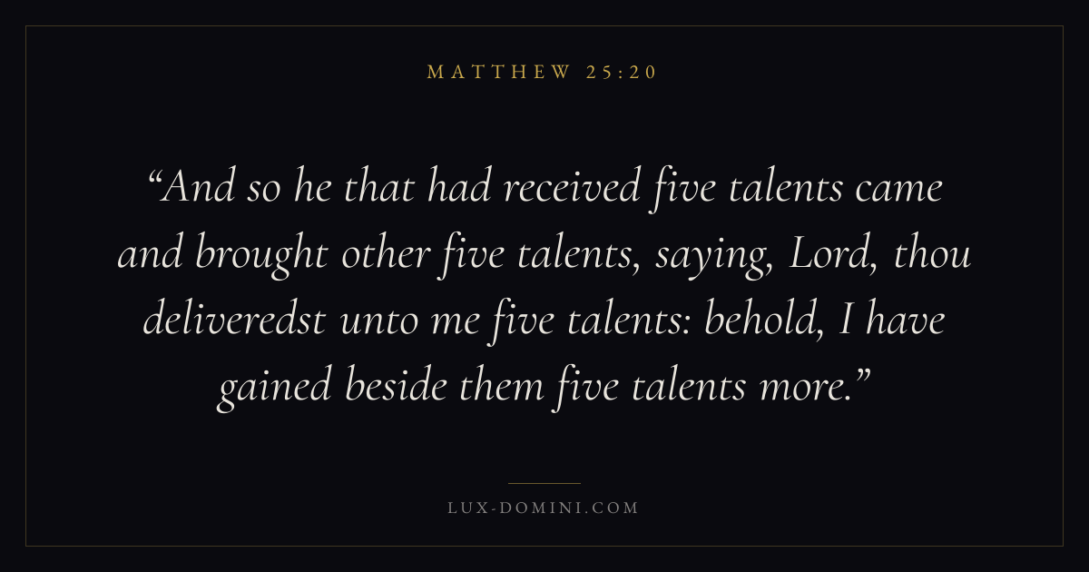 And so he that had received five talents came and brought other five talents, saying, Lord, thou deliveredst unto me five talents: behold, I have gained beside them five talents more.