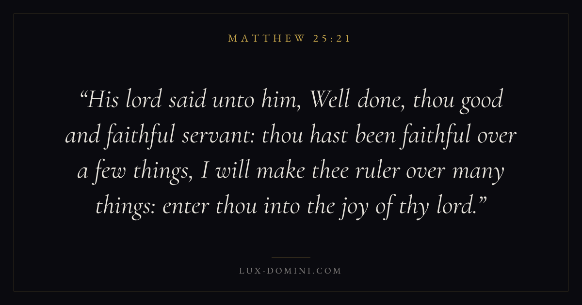 His lord said unto him, Well done, thou good and faithful servant: thou hast been faithful over a few things, I will make thee ruler over many things: enter thou into the joy of thy lord.