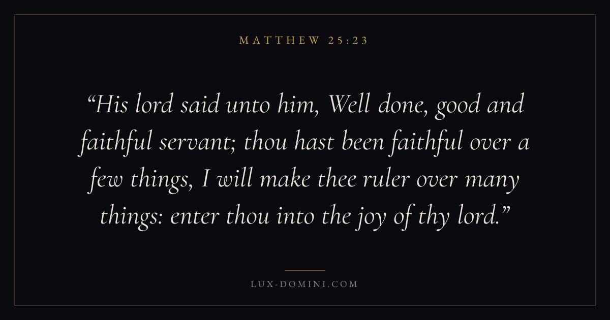 His lord said unto him, Well done, good and faithful servant; thou hast been faithful over a few things, I will make thee ruler over many things: enter thou into the joy of thy lord.