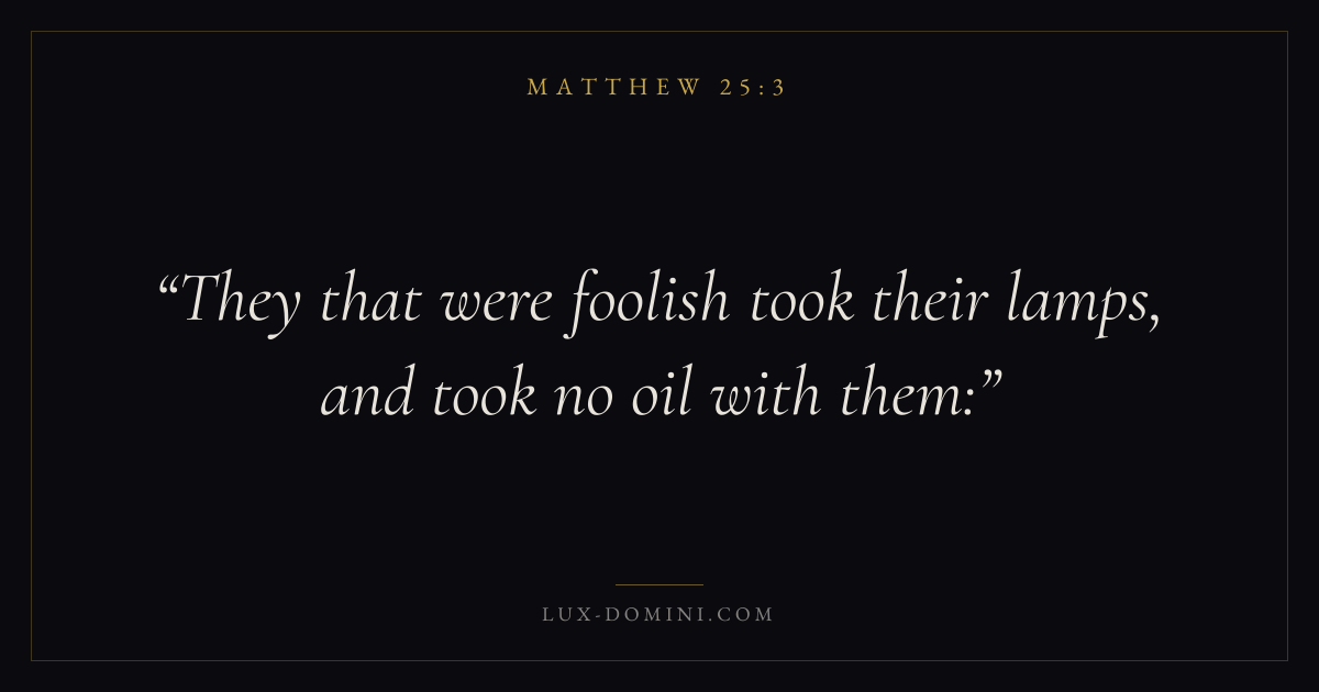 Books / Matthew / Chapter 25 / Verse 3 ← Matthew 25:2 Matthew 25:3 Matthew 25:4 → They that were foolish took their lamps, and took no oil with them: Download verse card Share on Twitter Share on Facebook Pin it ✦ Key themes FulfillmentKingdom of heavenDiscipleshipTeaching Read with Matthew 25:4 ✦ Matthew Chapter 25 verses V. 1 V. 2 V. 3 V. 4 V. 5 V. 6 V. 7 V. 8 V. 9 V. 10 V. 11 V. 12 V. 13 V. 14 V. 15 V. 16 V. 17 V. 18 V. 19 V. 20 V. 21 V. 22 V. 23 V. 24 V. 25 V. 26 V. 27 V. 28 V. 29 V. 30 V. 31 V. 32 V. 33 V. 34 V. 35 V. 36 V. 37 V. 38 V. 39 V. 40 V. 41 V. 42 V. 43 V. 44 V. 45 V. 46