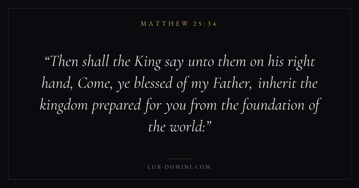 Then shall the King say unto them on his right hand, Come, ye blessed of my Father, inherit the kingdom prepared for you from the foundation of the world: