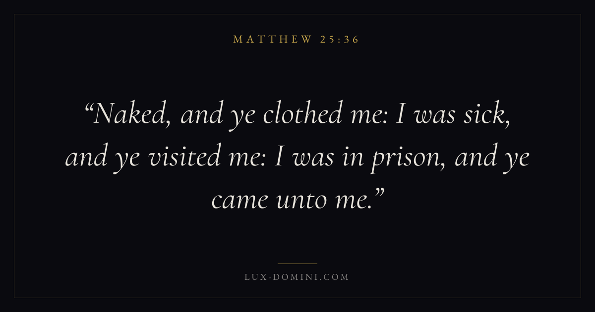 Naked, and ye clothed me: I was sick, and ye visited me: I was in prison, and ye came unto me.