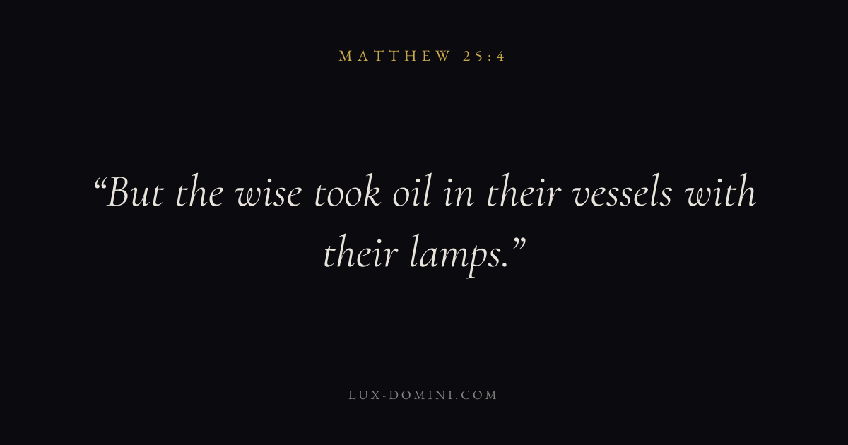 Books / Matthew / Chapter 25 / Verse 4 ← Matthew 25:3 Matthew 25:4 Matthew 25:5 → But the wise took oil in their vessels with their lamps. Download verse card Share on Twitter Share on Facebook Pin it ✦ Key themes WisdomFulfillmentKingdom of heavenDiscipleship Read with Matthew 25:3Proverbs 1:7James 1:5 Related topics Bible verses about wisdom ✦ Matthew Chapter 25 verses V. 1 V. 2 V. 3 V. 4 V. 5 V. 6 V. 7 V. 8 V. 9 V. 10 V. 11 V. 12 V. 13 V. 14 V. 15 V. 16 V. 17 V. 18 V. 19 V. 20 V. 21 V. 22 V. 23 V. 24 V. 25 V. 26 V. 27 V. 28 V. 29 V. 30 V. 31 V. 32 V. 33 V. 34 V. 35 V. 36 V. 37 V. 38 V. 39 V. 40 V. 41 V. 42 V. 43 V. 44 V. 45 V. 46