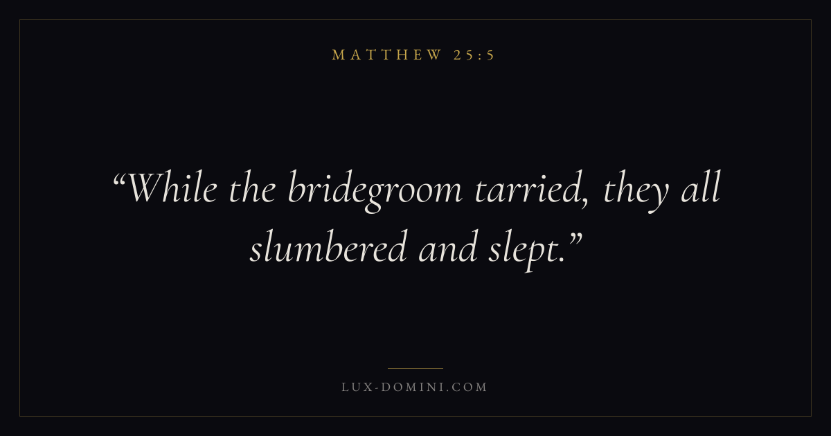 Books / Matthew / Chapter 25 / Verse 5 ← Matthew 25:4 Matthew 25:5 Matthew 25:6 → While the bridegroom tarried, they all slumbered and slept. Download verse card Share on Twitter Share on Facebook Pin it ✦ Key themes FulfillmentKingdom of heavenDiscipleshipTeaching Read with Matthew 25:6Matthew 25:7 ✦ Matthew Chapter 25 verses V. 1 V. 2 V. 3 V. 4 V. 5 V. 6 V. 7 V. 8 V. 9 V. 10 V. 11 V. 12 V. 13 V. 14 V. 15 V. 16 V. 17 V. 18 V. 19 V. 20 V. 21 V. 22 V. 23 V. 24 V. 25 V. 26 V. 27 V. 28 V. 29 V. 30 V. 31 V. 32 V. 33 V. 34 V. 35 V. 36 V. 37 V. 38 V. 39 V. 40 V. 41 V. 42 V. 43 V. 44 V. 45 V. 46