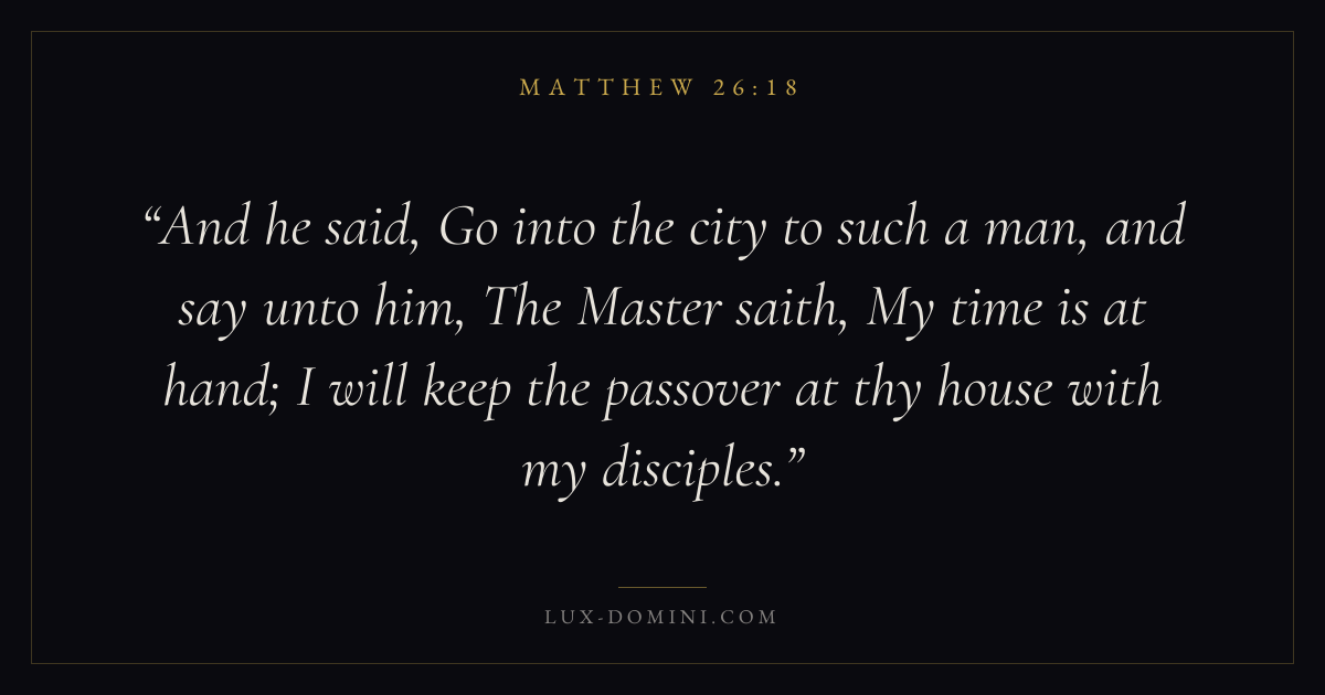 And he said, Go into the city to such a man, and say unto him, The Master saith, My time is at hand; I will keep the passover at thy house with my disciples.