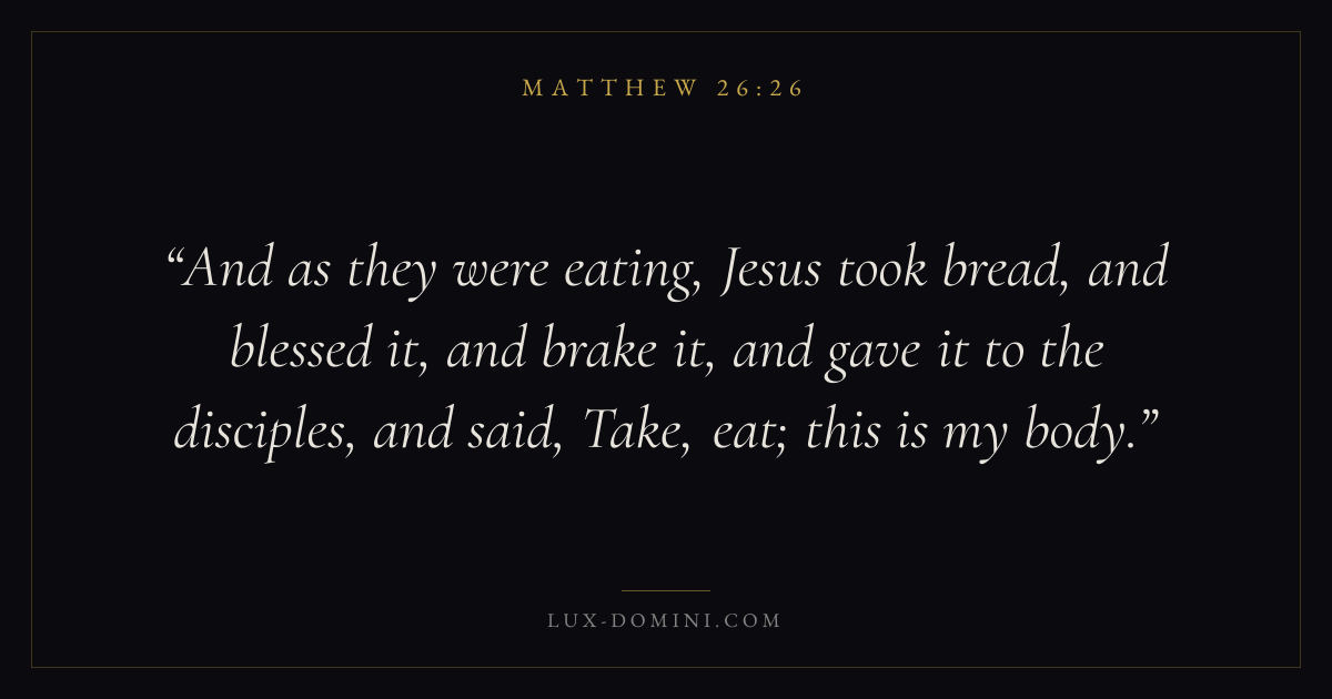 And as they were eating, Jesus took bread, and blessed it, and brake it, and gave it to the disciples, and said, Take, eat; this is my body.
