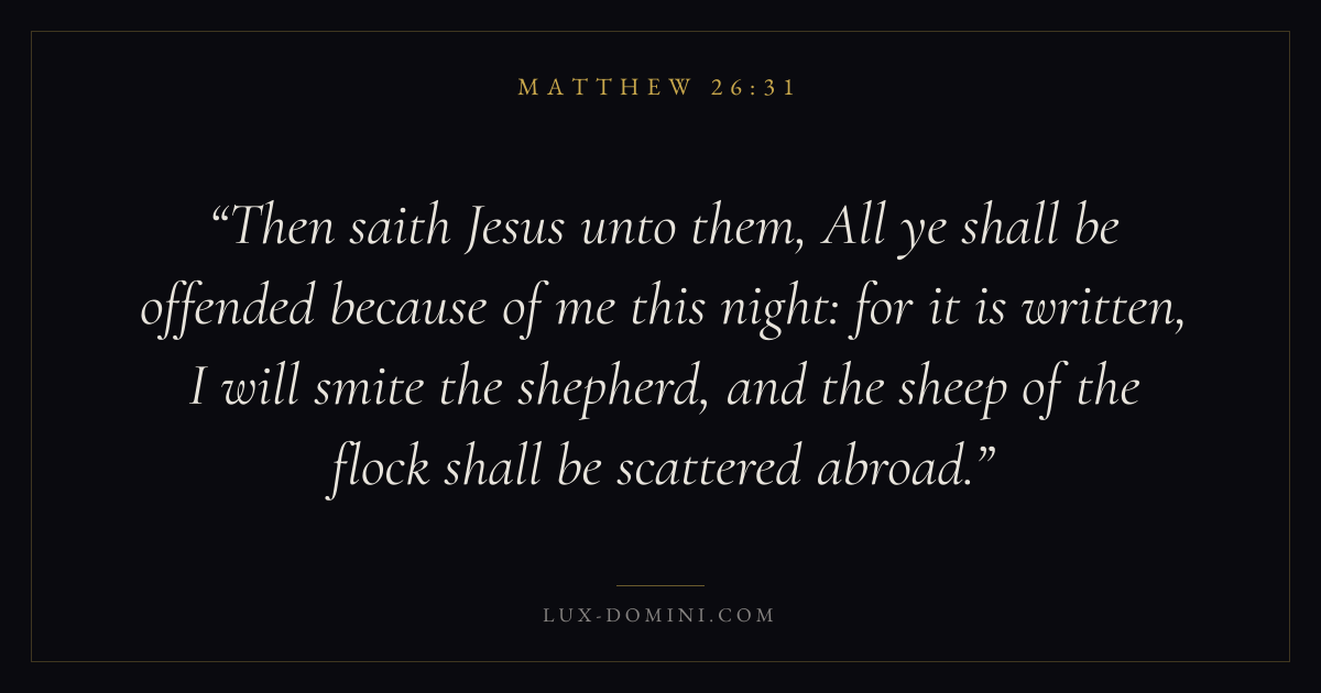 Then saith Jesus unto them, All ye shall be offended because of me this night: for it is written, I will smite the shepherd, and the sheep of the flock shall be scattered abroad.