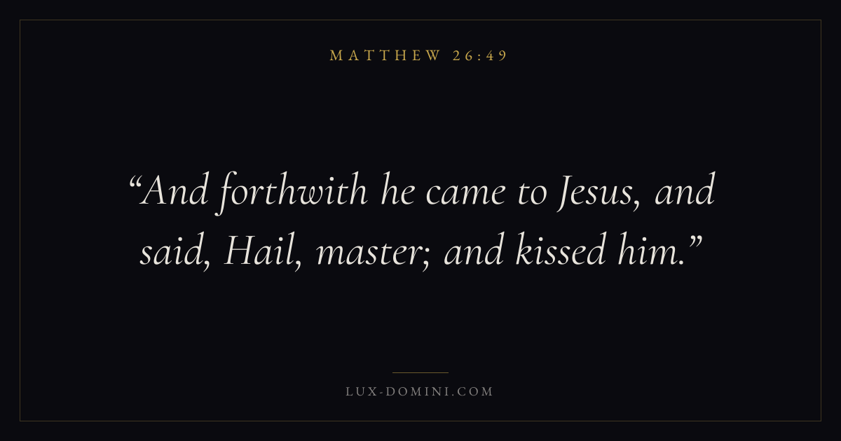 Books / Matthew / Chapter 26 / Verse 49 ← Matthew 26:48 Matthew 26:49 Matthew 26:50 → And forthwith he came to Jesus, and said, Hail, master; and kissed him. Download verse card Share on Twitter Share on Facebook Pin it ✦ Key themes FulfillmentKingdom of heavenDiscipleshipTeaching Read with Matthew 26:47Matthew 26:48 ✦ Matthew Chapter 26 verses V. 1 V. 2 V. 3 V. 4 V. 5 V. 6 V. 7 V. 8 V. 9 V. 10 V. 11 V. 12 V. 13 V. 14 V. 15 V. 16 V. 17 V. 18 V. 19 V. 20 V. 21 V. 22 V. 23 V. 24 V. 25 V. 26 V. 27 V. 28 V. 29 V. 30 V. 31 V. 32 V. 33 V. 34 V. 35 V. 36 V. 37 V. 38 V. 39 V. 40 V. 41 V. 42 V. 43 V. 44 V. 45 V. 46 V. 47 V. 48 V. 49 V. 50 V. 51 V. 52 V. 53 V. 54 V. 55 V. 56 V. 57 V. 58 V. 59 V. 60 V. 61 V. 62 V. 63 V. 64 V. 65 V. 66 V. 67 V. 68 V. 69 V. 70 V. 71 V. 72 V. 73 V. 74 V. 75