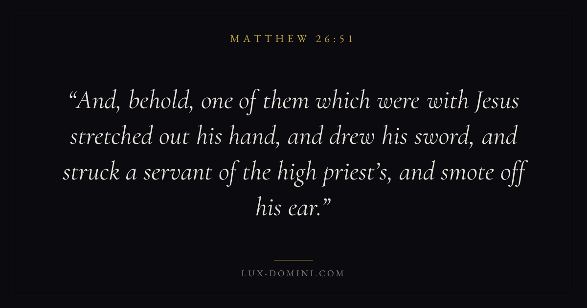 And, behold, one of them which were with Jesus stretched out his hand, and drew his sword, and struck a servant of the high priest’s, and smote off his ear.