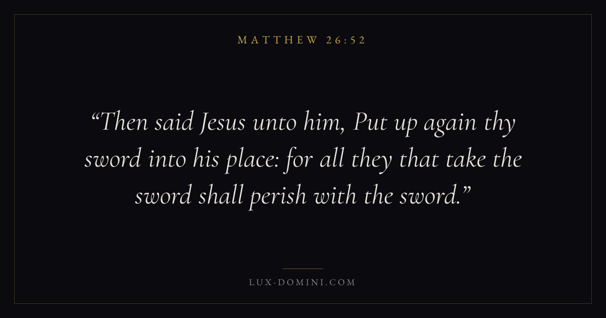 Then said Jesus unto him, Put up again thy sword into his place: for all they that take the sword shall perish with the sword.