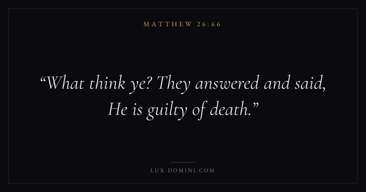 Books / Matthew / Chapter 26 / Verse 66 ← Matthew 26:65 Matthew 26:66 Matthew 26:67 → What think ye? They answered and said, He is guilty of death. Download verse card Share on Twitter Share on Facebook Pin it ✦ Key themes FulfillmentKingdom of heavenDiscipleshipTeaching Read with Matthew 26:67Matthew 26:68 ✦ Matthew Chapter 26 verses V. 1 V. 2 V. 3 V. 4 V. 5 V. 6 V. 7 V. 8 V. 9 V. 10 V. 11 V. 12 V. 13 V. 14 V. 15 V. 16 V. 17 V. 18 V. 19 V. 20 V. 21 V. 22 V. 23 V. 24 V. 25 V. 26 V. 27 V. 28 V. 29 V. 30 V. 31 V. 32 V. 33 V. 34 V. 35 V. 36 V. 37 V. 38 V. 39 V. 40 V. 41 V. 42 V. 43 V. 44 V. 45 V. 46 V. 47 V. 48 V. 49 V. 50 V. 51 V. 52 V. 53 V. 54 V. 55 V. 56 V. 57 V. 58 V. 59 V. 60 V. 61 V. 62 V. 63 V. 64 V. 65 V. 66 V. 67 V. 68 V. 69 V. 70 V. 71 V. 72 V. 73 V. 74 V. 75