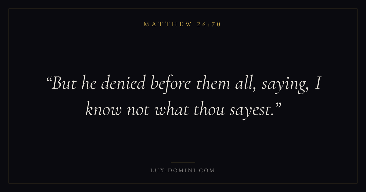 Books / Matthew / Chapter 26 / Verse 70 ← Matthew 26:69 Matthew 26:70 Matthew 26:71 → But he denied before them all, saying, I know not what thou sayest. Download verse card Share on Twitter Share on Facebook Pin it ✦ Key themes FulfillmentKingdom of heavenDiscipleshipTeaching Read with Matthew 26:69Matthew 26:71 ✦ Matthew Chapter 26 verses V. 1 V. 2 V. 3 V. 4 V. 5 V. 6 V. 7 V. 8 V. 9 V. 10 V. 11 V. 12 V. 13 V. 14 V. 15 V. 16 V. 17 V. 18 V. 19 V. 20 V. 21 V. 22 V. 23 V. 24 V. 25 V. 26 V. 27 V. 28 V. 29 V. 30 V. 31 V. 32 V. 33 V. 34 V. 35 V. 36 V. 37 V. 38 V. 39 V. 40 V. 41 V. 42 V. 43 V. 44 V. 45 V. 46 V. 47 V. 48 V. 49 V. 50 V. 51 V. 52 V. 53 V. 54 V. 55 V. 56 V. 57 V. 58 V. 59 V. 60 V. 61 V. 62 V. 63 V. 64 V. 65 V. 66 V. 67 V. 68 V. 69 V. 70 V. 71 V. 72 V. 73 V. 74 V. 75