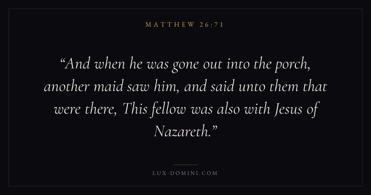 And when he was gone out into the porch, another maid saw him, and said unto them that were there, This fellow was also with Jesus of Nazareth.