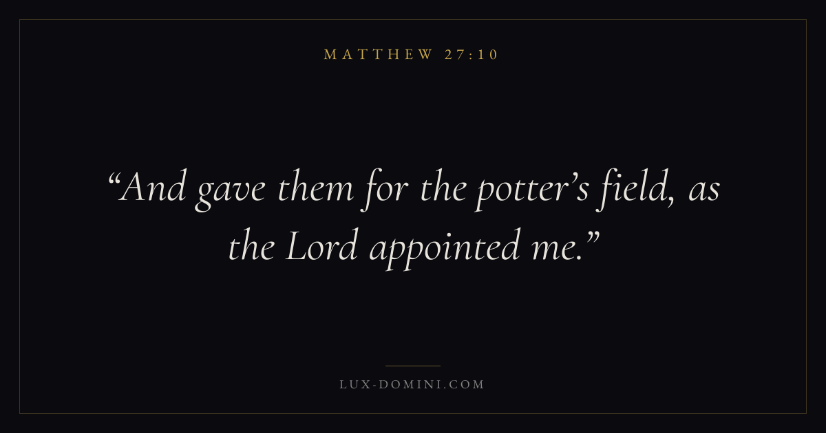 Books / Matthew / Chapter 27 / Verse 10 ← Matthew 27:9 Matthew 27:10 Matthew 27:11 → And gave them for the potter’s field, as the Lord appointed me. Download verse card Share on Twitter Share on Facebook Pin it ✦ Key themes FulfillmentKingdom of heavenDiscipleshipTeaching Read with Matthew 27:8Matthew 27:9 ✦ Matthew Chapter 27 verses V. 1 V. 2 V. 3 V. 4 V. 5 V. 6 V. 7 V. 8 V. 9 V. 10 V. 11 V. 12 V. 13 V. 14 V. 15 V. 16 V. 17 V. 18 V. 19 V. 20 V. 21 V. 22 V. 23 V. 24 V. 25 V. 26 V. 27 V. 28 V. 29 V. 30 V. 31 V. 32 V. 33 V. 34 V. 35 V. 36 V. 37 V. 38 V. 39 V. 40 V. 41 V. 42 V. 43 V. 44 V. 45 V. 46 V. 47 V. 48 V. 49 V. 50 V. 51 V. 52 V. 53 V. 54 V. 55 V. 56 V. 57 V. 58 V. 59 V. 60 V. 61 V. 62 V. 63 V. 64 V. 65 V. 66