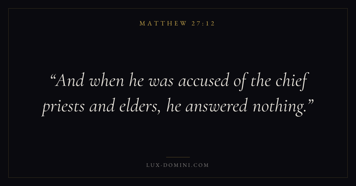 Books / Matthew / Chapter 27 / Verse 12 ← Matthew 27:11 Matthew 27:12 Matthew 27:13 → And when he was accused of the chief priests and elders, he answered nothing. Download verse card Share on Twitter Share on Facebook Pin it ✦ Key themes FulfillmentKingdom of heavenDiscipleshipTeaching Read with Matthew 27:8Matthew 27:9 ✦ Matthew Chapter 27 verses V. 1 V. 2 V. 3 V. 4 V. 5 V. 6 V. 7 V. 8 V. 9 V. 10 V. 11 V. 12 V. 13 V. 14 V. 15 V. 16 V. 17 V. 18 V. 19 V. 20 V. 21 V. 22 V. 23 V. 24 V. 25 V. 26 V. 27 V. 28 V. 29 V. 30 V. 31 V. 32 V. 33 V. 34 V. 35 V. 36 V. 37 V. 38 V. 39 V. 40 V. 41 V. 42 V. 43 V. 44 V. 45 V. 46 V. 47 V. 48 V. 49 V. 50 V. 51 V. 52 V. 53 V. 54 V. 55 V. 56 V. 57 V. 58 V. 59 V. 60 V. 61 V. 62 V. 63 V. 64 V. 65 V. 66