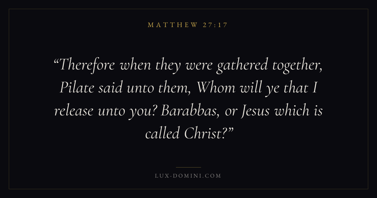 Therefore when they were gathered together, Pilate said unto them, Whom will ye that I release unto you? Barabbas, or Jesus which is called Christ?