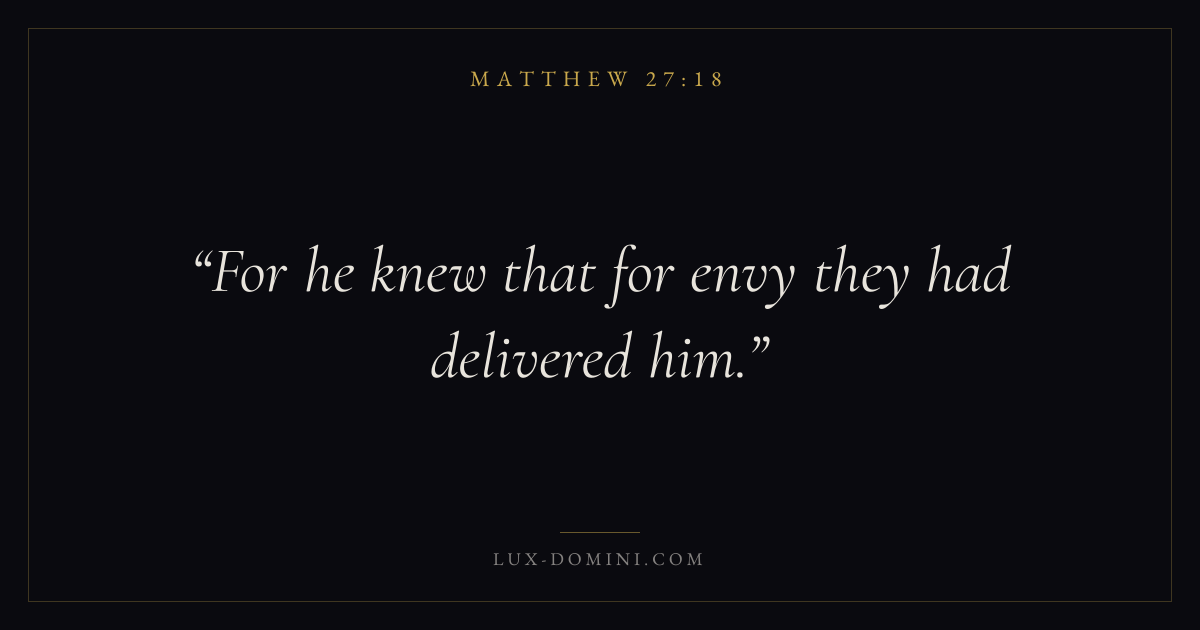 Books / Matthew / Chapter 27 / Verse 18 ← Matthew 27:17 Matthew 27:18 Matthew 27:19 → For he knew that for envy they had delivered him. Download verse card Share on Twitter Share on Facebook Pin it ✦ Key themes FulfillmentKingdom of heavenDiscipleshipTeaching ✦ Matthew Chapter 27 verses V. 1 V. 2 V. 3 V. 4 V. 5 V. 6 V. 7 V. 8 V. 9 V. 10 V. 11 V. 12 V. 13 V. 14 V. 15 V. 16 V. 17 V. 18 V. 19 V. 20 V. 21 V. 22 V. 23 V. 24 V. 25 V. 26 V. 27 V. 28 V. 29 V. 30 V. 31 V. 32 V. 33 V. 34 V. 35 V. 36 V. 37 V. 38 V. 39 V. 40 V. 41 V. 42 V. 43 V. 44 V. 45 V. 46 V. 47 V. 48 V. 49 V. 50 V. 51 V. 52 V. 53 V. 54 V. 55 V. 56 V. 57 V. 58 V. 59 V. 60 V. 61 V. 62 V. 63 V. 64 V. 65 V. 66