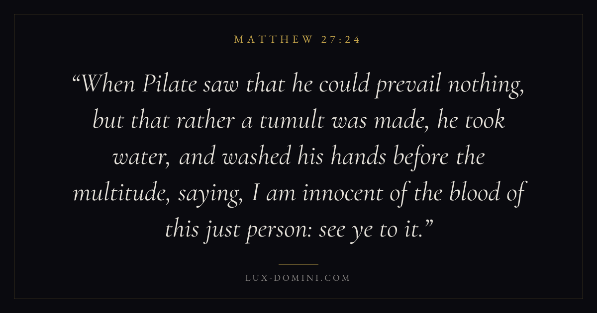 When Pilate saw that he could prevail nothing, but that rather a tumult was made, he took water, and washed his hands before the multitude, saying, I am innocent of the blood of this just person: see ye to it.