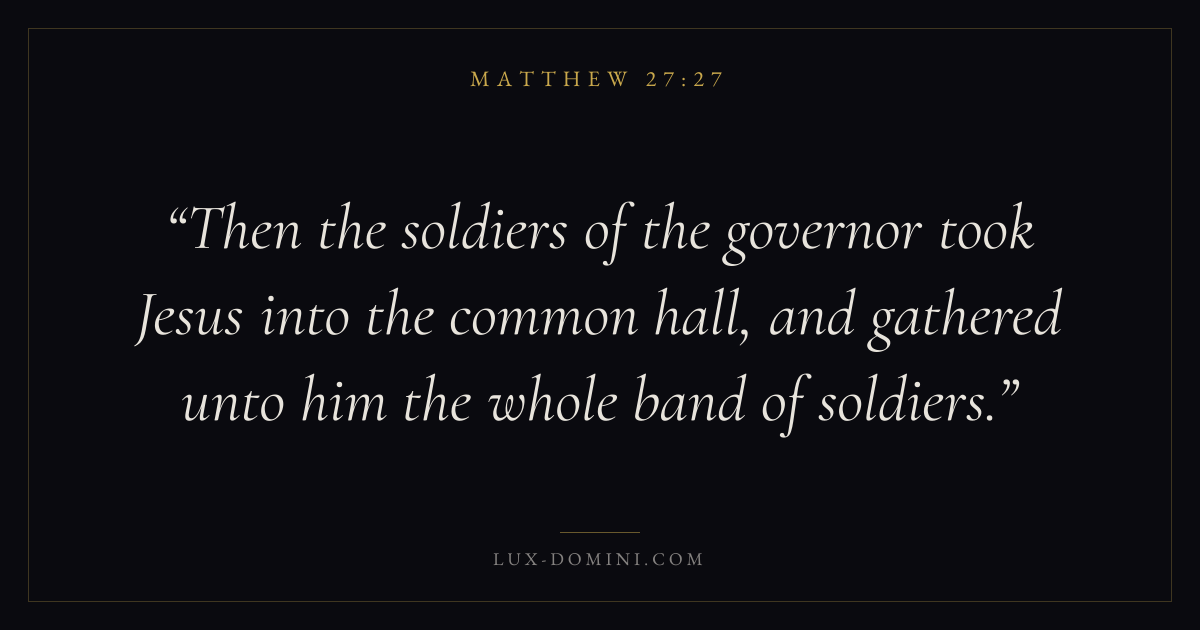 Then the soldiers of the governor took Jesus into the common hall, and gathered unto him the whole band of soldiers.