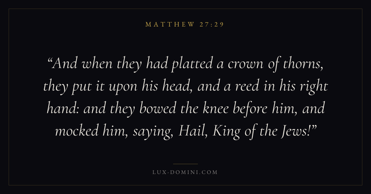 And when they had platted a crown of thorns, they put it upon his head, and a reed in his right hand: and they bowed the knee before him, and mocked him, saying, Hail, King of the Jews!